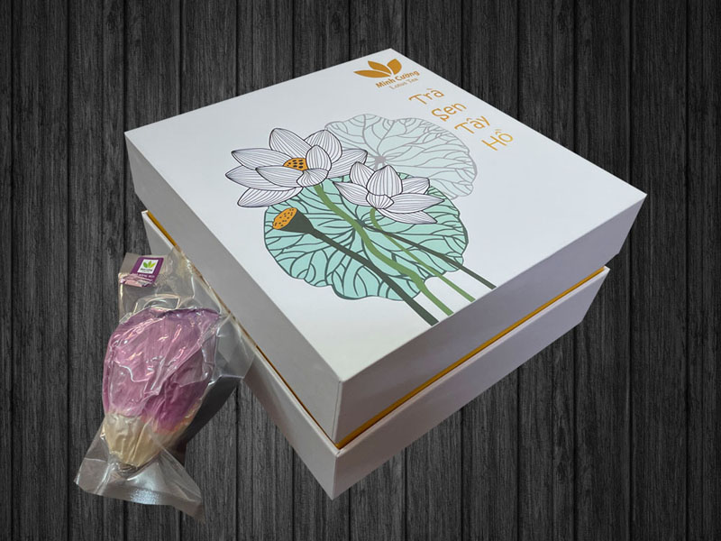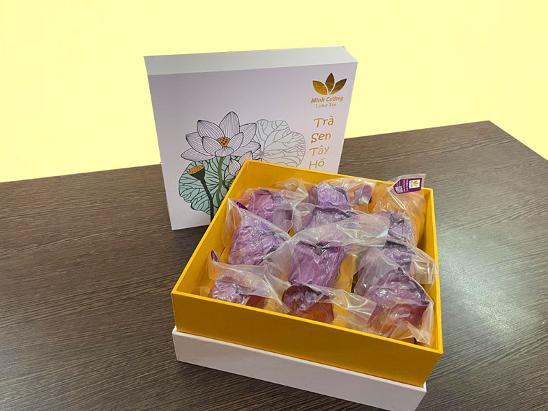 Trà bông sen Tây Hồ cao cấp sau khi sấy khô được hút chân không, đóng hộp carton lạnh, ép nhũ sang trọng, độc đáo.