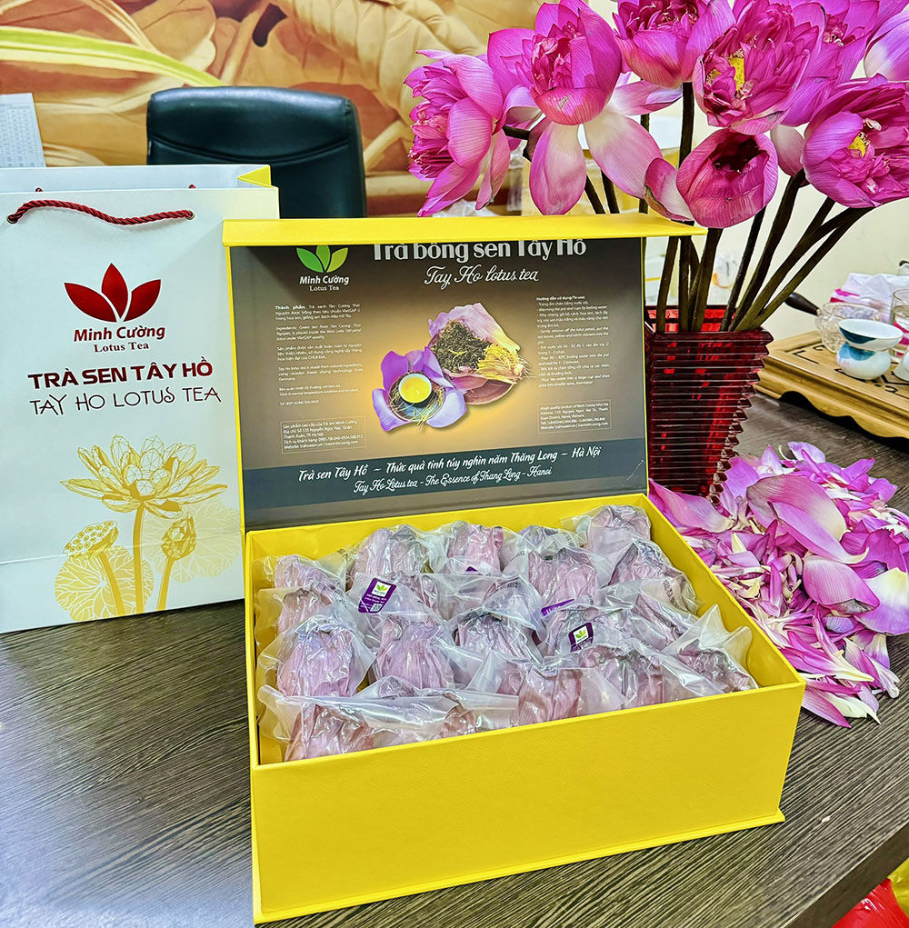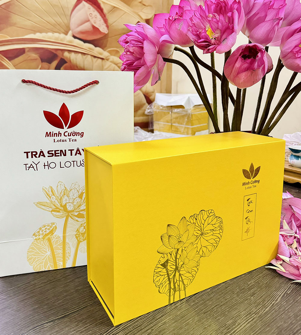 Trà bông sen Tây Hồ sau khi sấy khô được hút chân không, đựng trong hộp carton lạnh, giấy mỹ thuật, ép nhũ sang trọng.