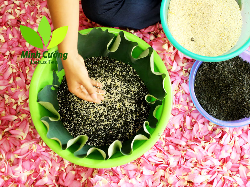 Công đoạn ướp trà sen truyền thống của Trà sen Minh Cường